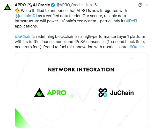 자본 및 생태적 결합 측면에서 APRO는 Polychain Capital과 Franklin Templeton의 투자 지원을 받았으며, BNB Chain, JuChain 등과 긴밀한 생태적 시너지를 달성했습니다. ATTP의 데이터 계층으로서 프로토콜 결합의 이점을 가지고 있습니다. 향후 멀티체인 Agent 모듈 의 표준 호출 구성 요소가 되어 크로스 프로토콜, 크로스 플랫폼, 크로스 체인 기반 데이터 네트워크를 형성하고, 신뢰 AI 시대의 인프라를 위한 첫 번째 선택이 될 것으로 예상됩니다.