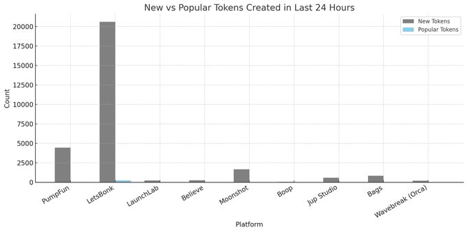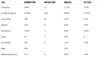 🥇 LetsBonk는 현재 토큰 생성에 가장 활발한 플랫폼으로, 총 생성량의 60% 이상을 차지하며 이슈 토큰 수도 가장 많습니다.