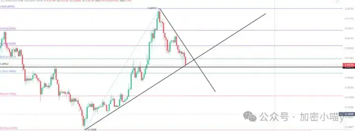 #도지코인(Doge): 0.198의 중요 지지선에 도달했으며, 피보나치 0.5-0.618 되돌림 구간에 있습니다. 좌측 구조에 이점이 있어 분할 매수가 가능합니다. 저항선은 0.214와 0.2215입니다.