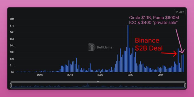 암호화폐 벤처캐피털(VC)이 얼마나 타격을 입었을까? 상승하는 펀딩 규모에 흥분했지만, 스파이크는 몇 가지 큰 이벤트에서 발생했습니다. - 바이낸스 20억 달러 딜 - 서클(Circle) 11억 달러 기업공개(IPO) - 6억 달러 초기 코인공개(ICO)와 4억 달러 '프라이빗 세일' (디파이라마(defillama)의 7월 데이터) 우리는 여전히 2022년 수치에 훨씬 못 미치고 있습니다.