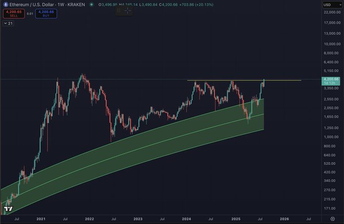 #ETH가 집으로 돌아간 이후 $4k를 돌파한 걸 볼 수 있지. 이번 사이클에서 ETH가 역대 최고가를 찍을 거라고 여전히 생각해. 그냥 먼저 집에 돌아갈 필요가 있었던 거지. (2025년 4월에 드디어 그게 일어났어.)