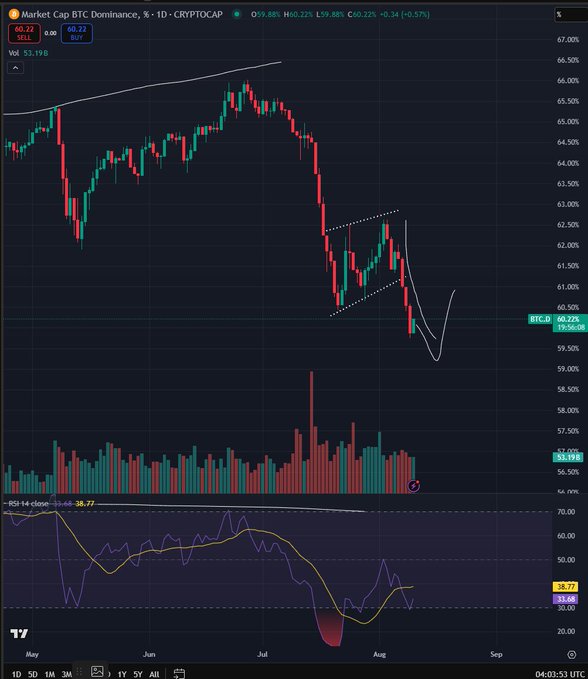 비트코인(BTC).d 반등은 여기까지인 것 같습니다. 앞으로 새로운 최저점으로 계속 하락할 것 같습니다 x.com/Bluntz_자본…