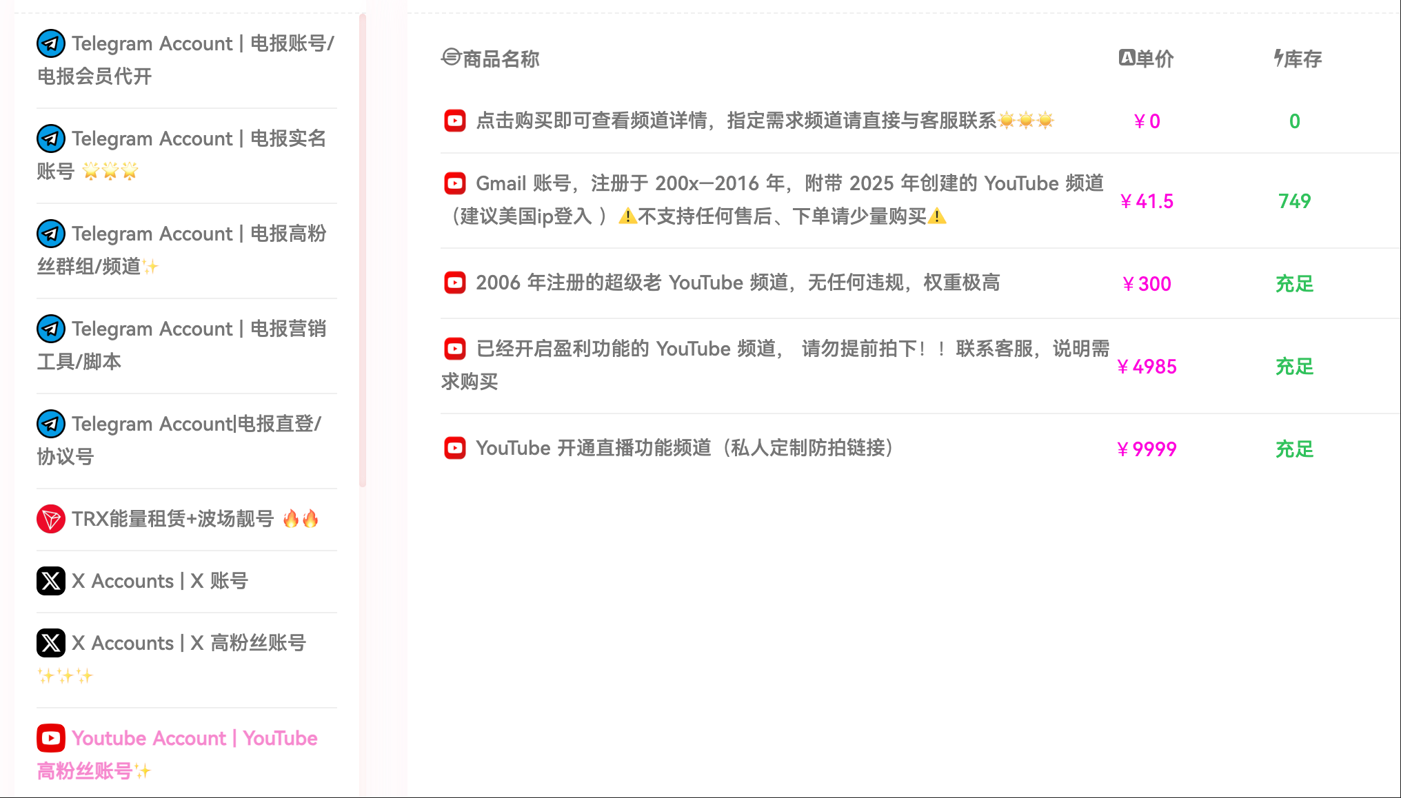 여기서 TGX 해외 계정 플랫폼에 대해 간략히 설명드리겠습니다. 이 플랫폼은 다음을 포함한 다양한 유형의 YouTube 계정을 제공합니다.