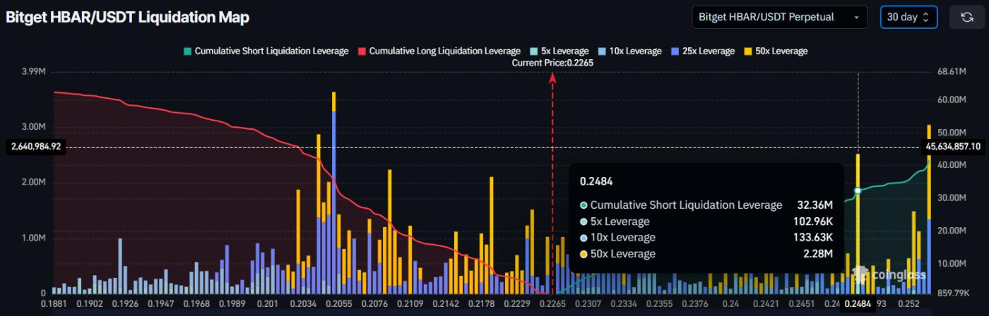 청산 데이터에 따르면, 헤데라해시그래프(HBAR) 다음 주요 저항선을 향해 상승할 경우 3,200만 달러 이상의 숏 계약이 청산될 수 있습니다. 주목해야 할 주요 가격대는 0.248달러로, 바로 직전 저항선 바로 위에 있습니다. 이 가격대를 돌파할 경우, 약세 포지션을 매도해야 하며, 이는 추가적인 매수 압력을 유발할 것입니다.