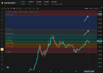 $ASTER 딥이 꽤 오래 걸렸네요. 다행히 지금은 피보나치 레벨이 훨씬 더 명확해졌어요. 이번 조정은 정확히 0.618과 0.236 피보나치 구간까지 왔습니다, 첫 임펄스를 어디서 잡느냐에 따라 달라지죠. 이제 트렌드 확장 기준으로 보면, 마지막 임펄스 기준으로 타겟은 2.67과 3.39입니다.
