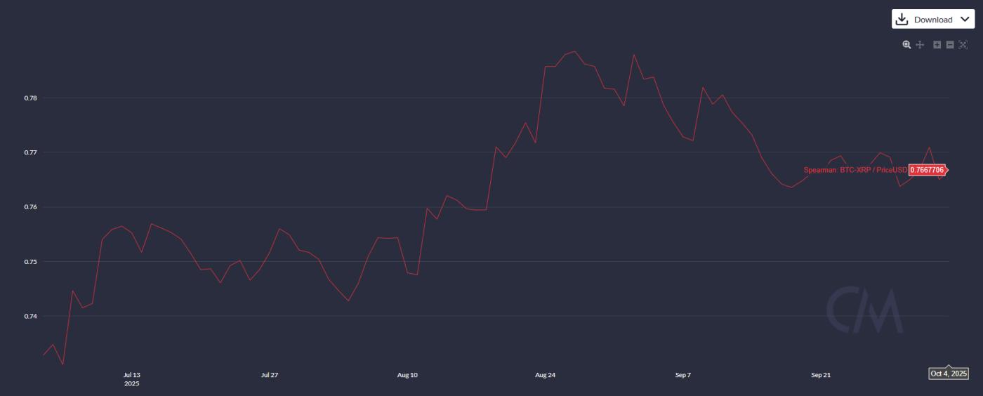 최신 스피어만 상관관계 차트(2025년 7월~10월)에 따르면 리플(XRP) 평균 상관관계 0.76을 유지하며 강력한 방향성 정렬을 보이고 있습니다. 이 지표는 8월 비트코인(BTC) 랠리 당시 0.78 근처에서 정점을 찍은 후 소폭 하락했습니다.