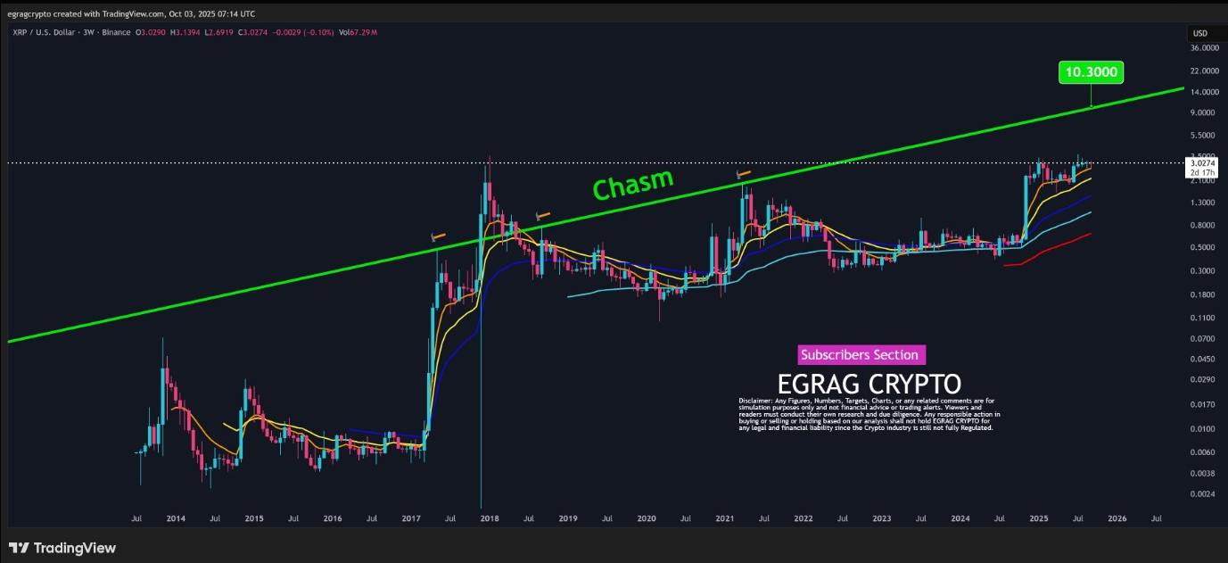 리플(XRP) 가격은 분석가들이 "캐즘(Chasm)"으로 불리는 장기 저항선에 직면하면서 여전히 가장 주목 받는 알트코인 중 하나입니다. 현재 3달러 선에서 거래되고 있으며, 몇 주 동안 꾸준한 매수세와 고래 매수세 증가로 안정적인 모습을 보이고 있습니다. 분석가들은 10.30달러를 돌파하는 것이 리플(XRP) 의 전환점이 될 수 있다고 낙관하고 있으며, 이는 11달러에서 37달러 사이의 목표가와 일치합니다.