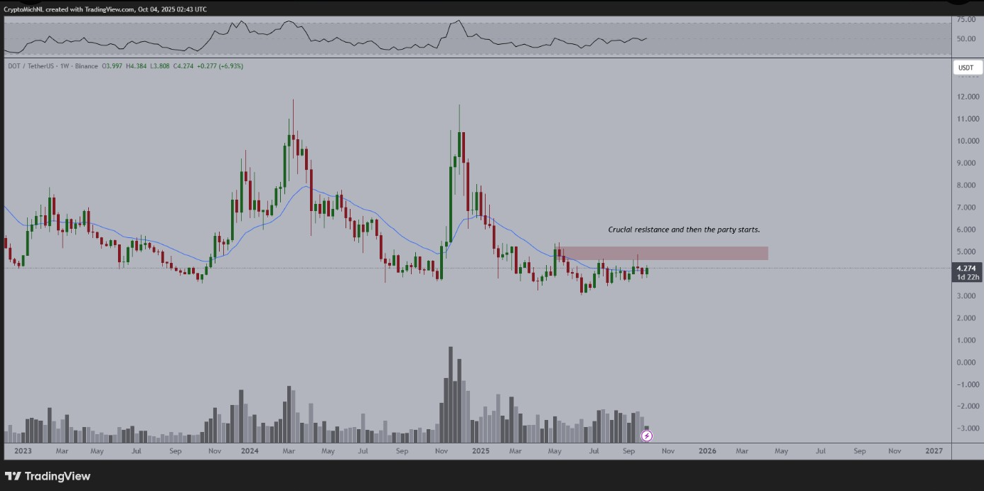 한편, 폴카닷(Polkadot) (폴카닷(DOT)) 은 주요 저항선인 5달러를 향해 가격이 모멘텀을 얻으면서 애널리스트들의 관심을 끌고 있습니다. 시장 전략가는 폴카닷(DOT) 몇 주 동안 횡보세를 보인 후 반등하기 시작했으며, 현재 약 4.20달러 에 거래되고 있다고 분석했습니다.