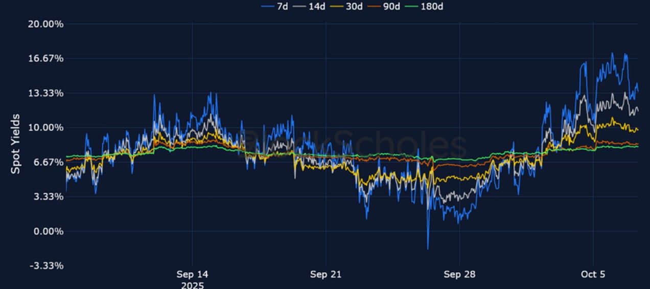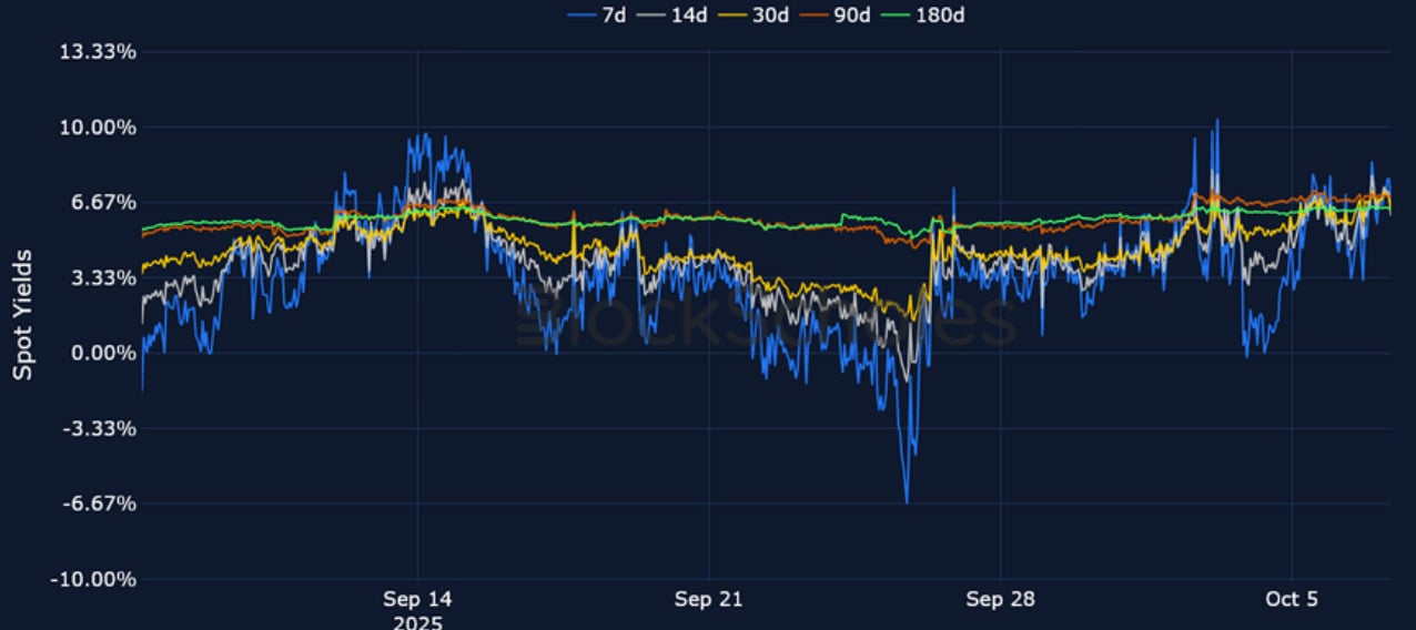 비트코인(BTC) 선물 내재 수익률 – 일요일 아침과 월요일 저녁, 두 차례의 연속된 최고치(ATH)로 인해 현물 수익률의 기간 구조가 반전되었습니다.