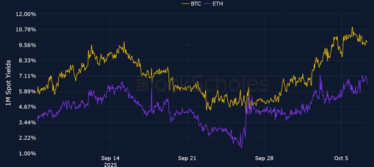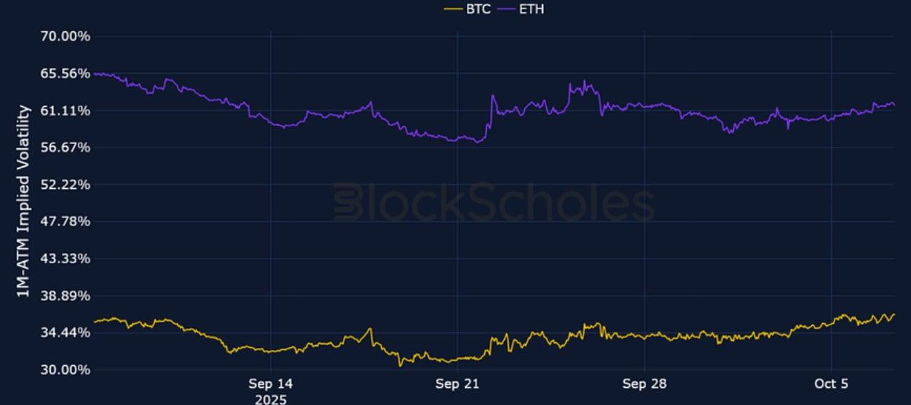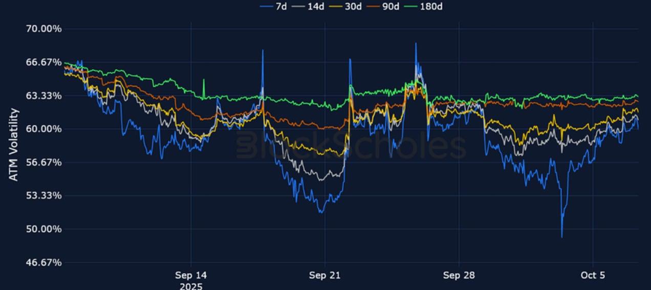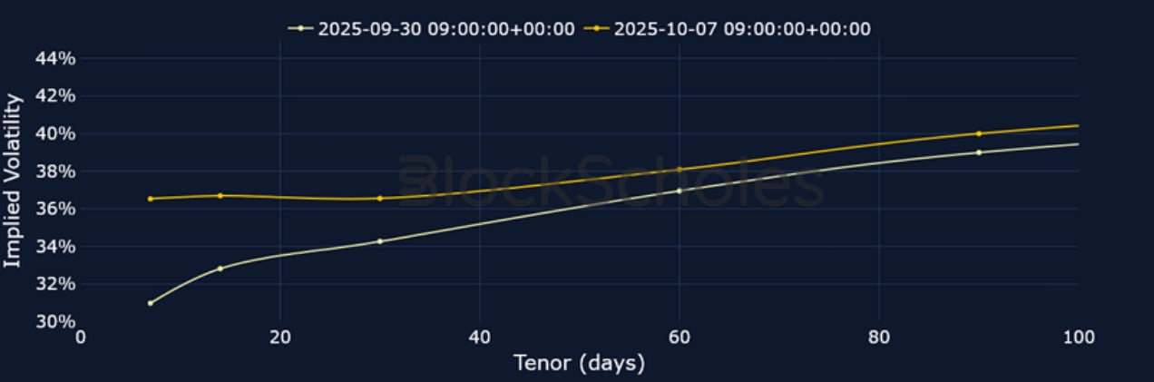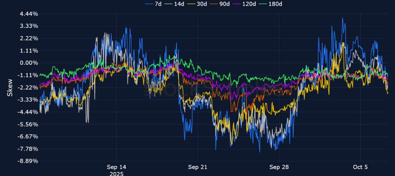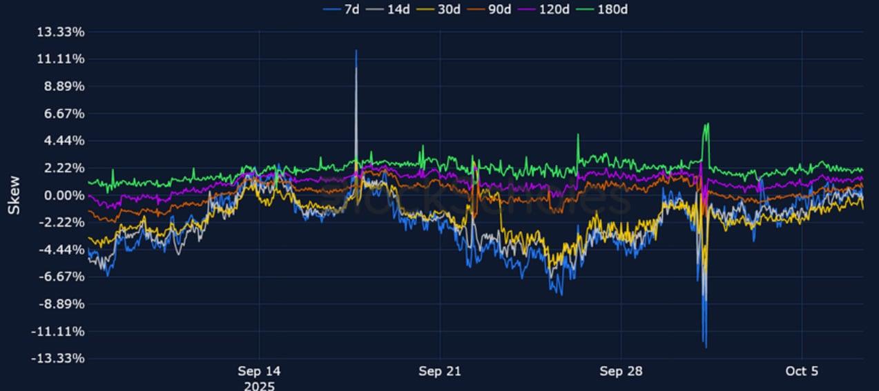 9월 말 이후, 비트코인(BTC) 과 암호화폐 시장은 월 중순 FOMC 회의 전후 매도세로 인한 손실을 회복하기 시작했습니다. 이러한 회복세는 '업토버(Uptober)'의 달로 접어들면서 두 차례 연속 사상 최고치를 경신하는 흐름으로 빠르게 확대되었습니다. 일요일 아침과 월요일 저녁에 비트코인(BTC) 강력한 현물 ETF 유입에 힘입어 사상 최고치를 경신했습니다. 지난주 현물 상품은 출시 이후 두 번째로 큰 주간 유입을 기록했습니다. 이로 인해 ATM 변동성 수준이 상승했고, 단기 옵션의 경우 외가격(OTM) 콜 옵션 쪽으로 소폭, 그러나 일시적인 스큐가 나타났습니다. 흥미롭게도, 이더리움(ETH) 현물의 큰 반등에도 불구하고 파생상품 시장은 보다 신중한 반응을 보였습니다. 단기 스큐는 중립 수준에 가깝게 거래되었고, 장기 옵션은 소폭의 외가격(OTM) 콜 프리미엄만을 받았습니다. 그럼에도 불구하고, 암호화폐 자산 가격은 적어도 현재로서는 주요 거시경제 데이터의 꾸준한 발표를 중단시킨 미국 연방 정부 폐쇄의 영향을 무시하고 있습니다.