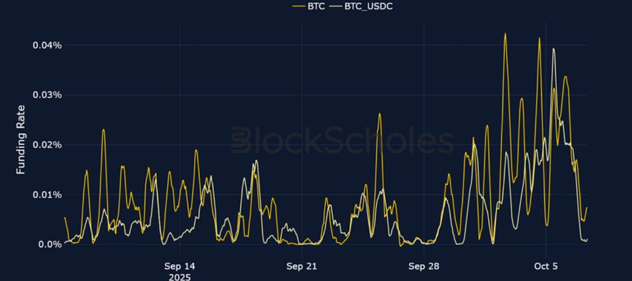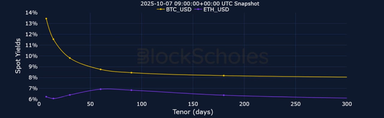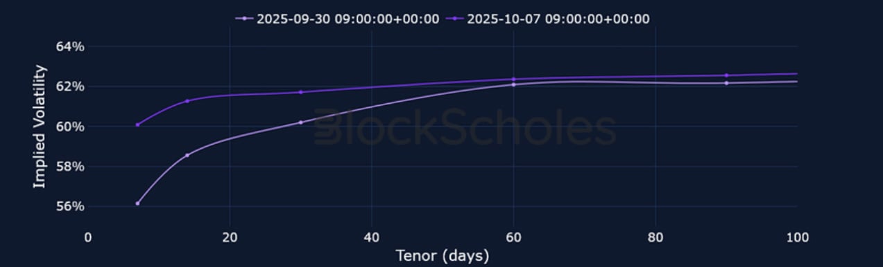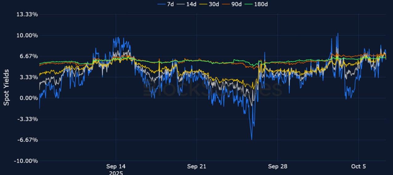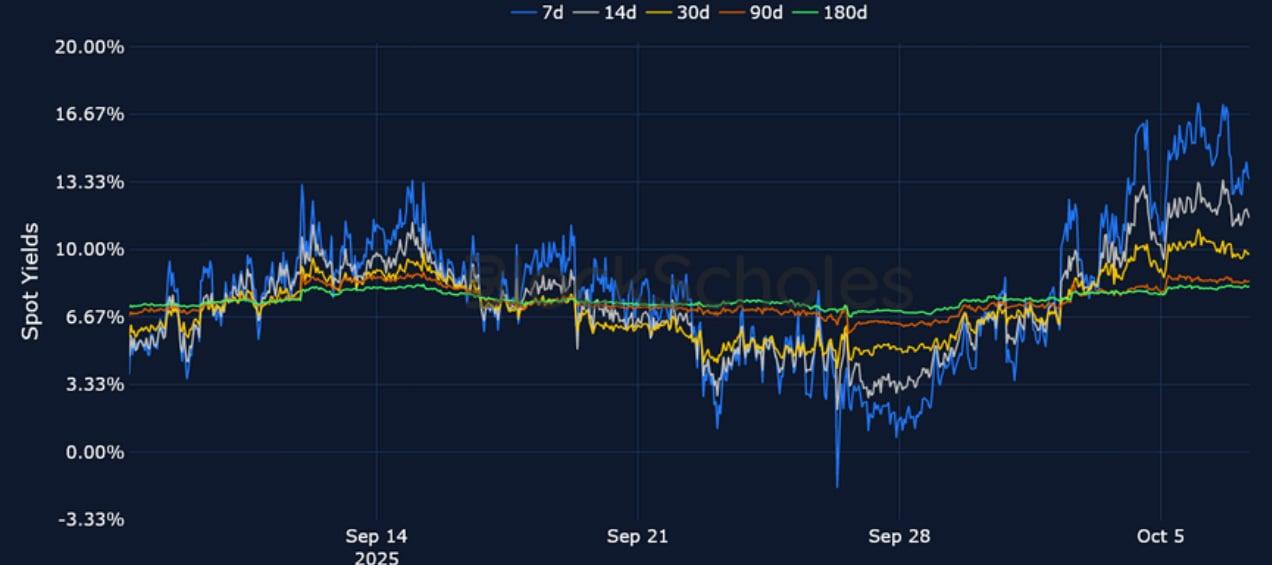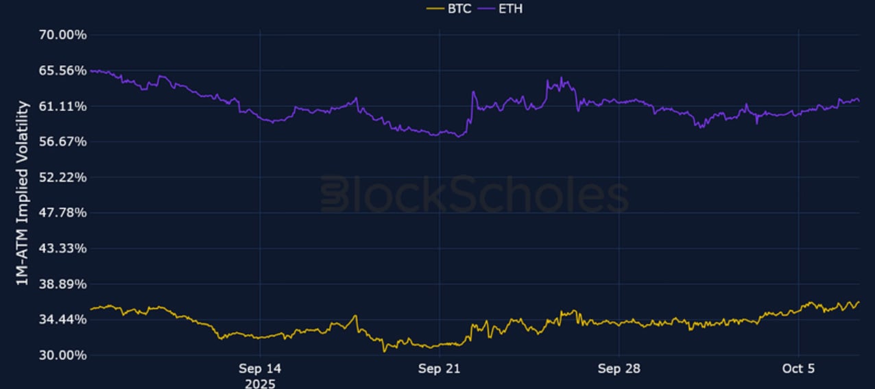 9월 말 이후, 비트코인(BTC) 과 암호화폐 시장은 월 중순 FOMC 회의 전후 매도세로 인한 손실을 회복하기 시작했습니다. 이러한 회복세는 '업토버(Uptober)'의 달로 접어들면서 두 차례 연속 사상 최고치를 경신하는 흐름으로 빠르게 확대되었습니다. 일요일 아침과 월요일 저녁에 비트코인(BTC) 강력한 현물 ETF 유입에 힘입어 사상 최고치를 경신했습니다. 지난주 현물 상품은 출시 이후 두 번째로 큰 주간 유입을 기록했습니다. 이로 인해 ATM 변동성 수준이 상승했고, 단기 옵션의 경우 외가격(OTM) 콜 옵션 쪽으로 소폭, 그러나 일시적인 스큐가 나타났습니다. 흥미롭게도, 이더리움(ETH) 현물의 큰 반등에도 불구하고 파생상품 시장은 보다 신중한 반응을 보였습니다. 단기 스큐는 중립 수준에 가깝게 거래되었고, 장기 옵션은 소폭의 외가격(OTM) 콜 프리미엄만을 받았습니다. 그럼에도 불구하고, 암호화폐 자산 가격은 적어도 현재로서는 주요 거시경제 데이터의 꾸준한 발표를 중단시킨 미국 연방 정부 폐쇄의 영향을 무시하고 있습니다.