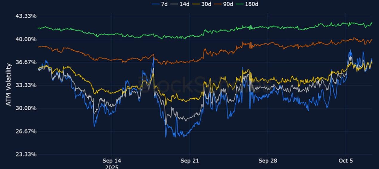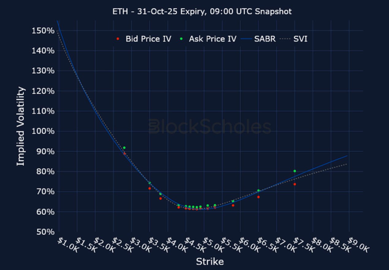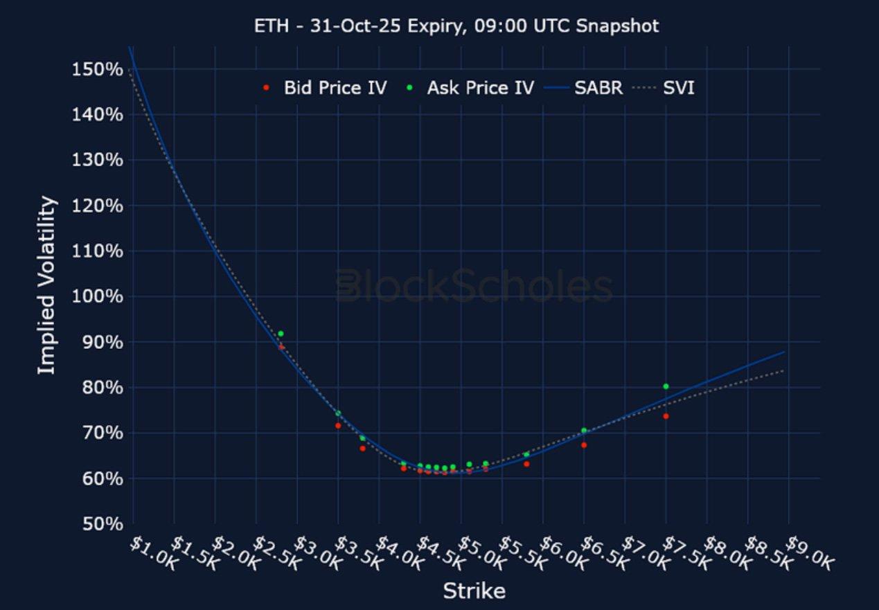 이더리움(ETH) SVI ATM 내재 변동성 – 2025년 10월 3일에 바닥을 친 후, 7일 ATM IV는 지난 며칠 동안 10볼륨 포인트 이상 급등했습니다.