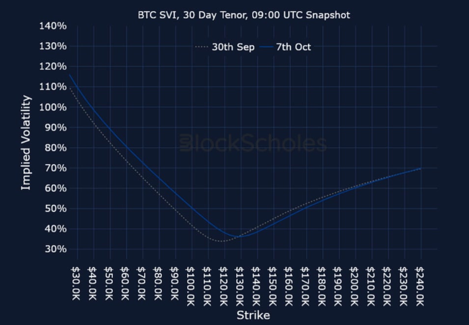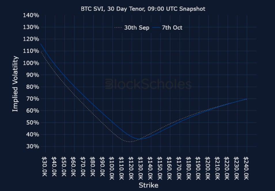 비트코인(BTC) SVI ATM 내재 변동성 – 9월 말에 횡보세를 보인 후, 비트코인(BTC) 매수세를 잡으면서 단기 변동성이 폭발적으로 증가했습니다.