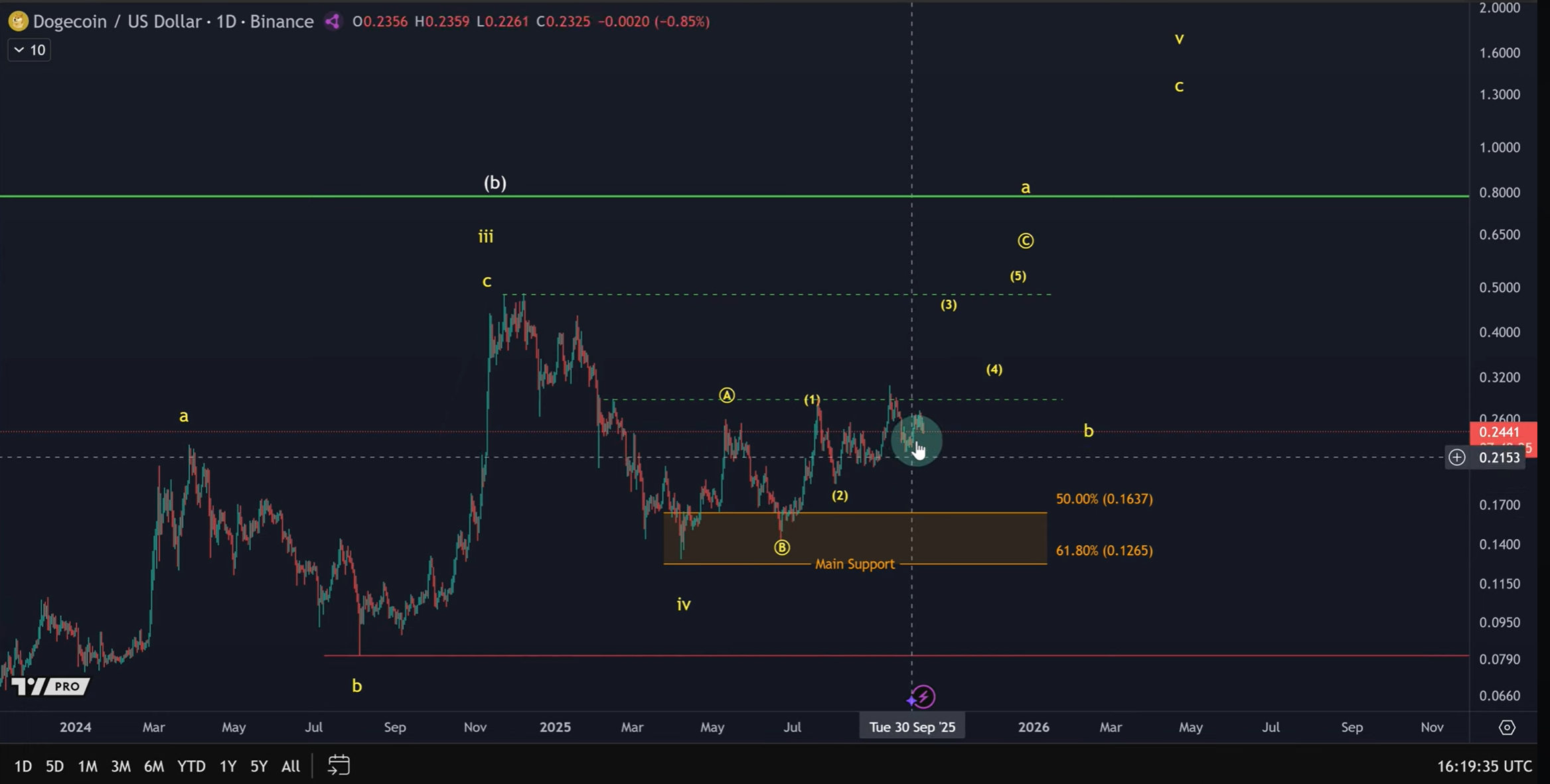 상승 확신은 9월 스윙 고점을 중심으로 움직입니다. "9월 마지막 스윙 고점을 돌파하면 $0.49 이상으로 상승할 가능성이 있습니다."라고 분석가는 말합니다. 이 수준은 첫 번째 고점 구간 진입 관문 역할을 합니다. 확실한 돌파는 9월 저점에서의 움직임이 조정 국면에서 충동적인 국면으로 전환되었음을 확인시켜 주며, 6월 B파 저점이 이미 형성되었다는 주장을 뒷받침합니다.
