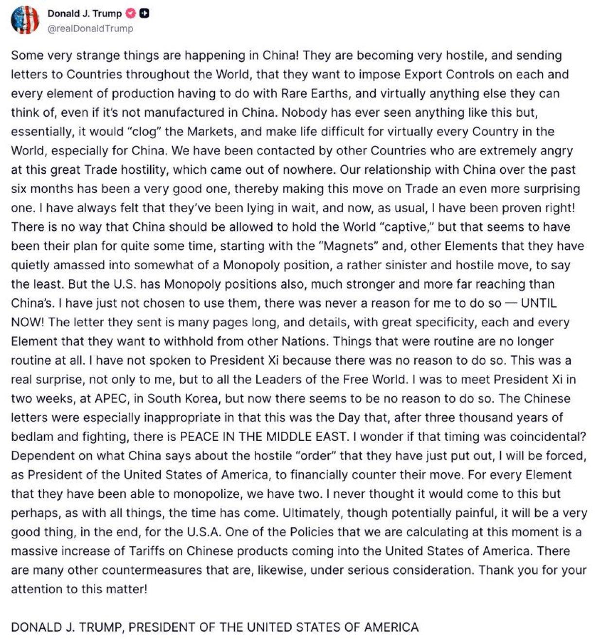 더욱이 트럼프 대통령은 중국에 판매되는 "핵심 소프트웨어"에 대한 수출 통제를 도입할 계획이라고 밝히며, 이를 중국의 글로벌 공급망 장악 강화에 대한 대응책으로 내세웠습니다. 이 발표는 투자자들에게 충격을 주었고, 전 세계 제조업, 기술, 그리고 원자재 시장을 교란시킬 수 있는 또 다른 장기 무역 전쟁에 대한 우려를 다시금 불러일으켰습니다.