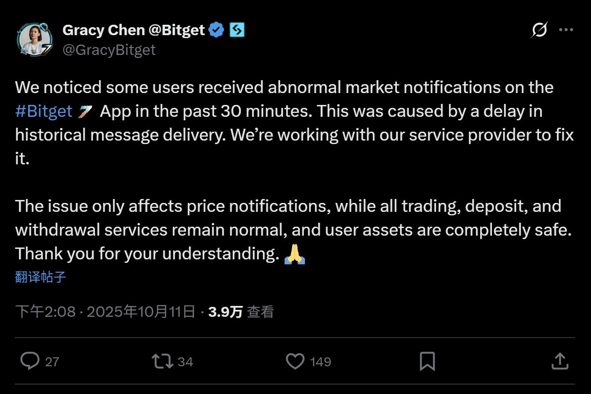 비트겟(Bitget) 전반적인 거래 안정성을 유지했지만, 알림 시스템 지연을 인정했습니다 . CEO 그레이시 첸(Gracy Chen)은 일부 사용자가 과거의 메시지 대기열 지연으로 인해 오래되거나 반복적으로 "비정상적인 시장" 알림을 받았다고 설명했습니다. 이 문제는 약 30분 동안 지속되었으며, 가격 알림에만 영향을 미쳤으며 모든 거래, 입금 및 출금은 정상적으로 작동했습니다 .