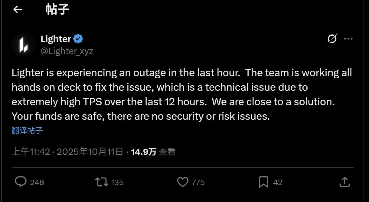 탈중앙화 영구 거래소 Lighter가 가장 심각한 장애를 겪었습니다. 피에이뉴스(PANews) 에 따르면, 해당 플랫폼은 12시간 동안 거래 처리량이 사상 최고치를 기록한 후 1시간 동안 중단되었습니다. 사용자는 해당 시간 동안 거래를 실행하거나 실행할 수 없었습니다. 이후 개발팀은 모든 자금이 안전하며 보안 사고는 발생하지 않았다고 확인했지만, 네트워크 초당 거래 수(TPS) 통제 불능 수준으로 급증할 경우 탈중앙화 거래소(DEX) 확장성의 한계가 드러났습니다.