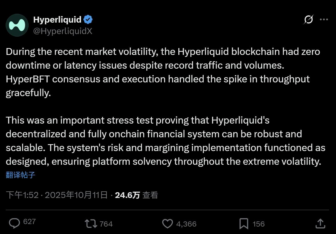 탈중앙화 플랫폼 중에서도 Hyperliquid는 단연 돋보였습니다. 기록적인 온체인 트래픽에도 불구하고, HyperBFT 합의 계층과 위험 관리 메커니즘이 "다운타임이나 지연 없이" 급증을 처리했다고 거래소 측은 확인했습니다. 이 행사는 변동성이 큰 시장 상황에서 Hyperliquid의 확장성과 안정성을 효과적으로 보여주는 사례였습니다.