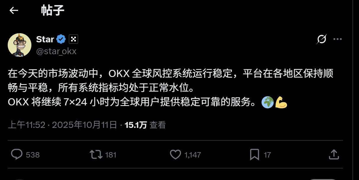 오케이엑스(OKX) 다시 한번 신뢰성을 입증했습니다. CEO 스타(쉬밍싱)는 X에서 OKX의 글로벌 위험 관리 시스템이 "완전히 안정적"이며 모든 운영 지표가 정상 수준이라고 발표했습니다. 기록적인 거래량에도 불구하고 오케이엑스(OKX) 모든 지역에서 다운타임, API 지연, 그리고 중단 없는 거래를 기록했습니다.