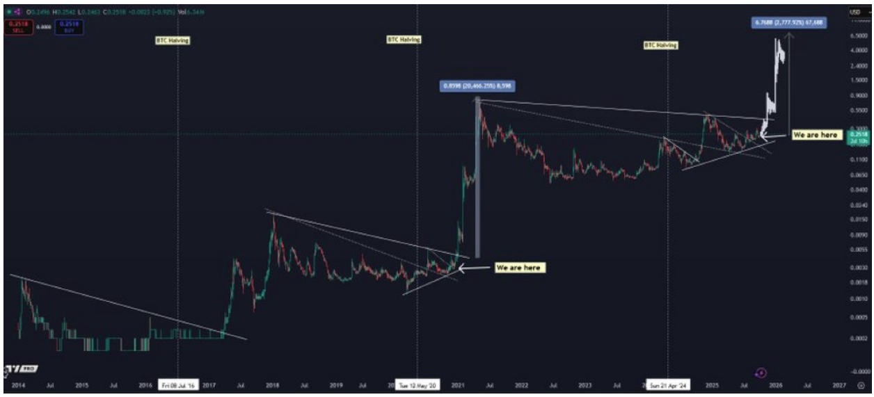 과거 도지코인(Dogecoin) 비트코인 반감기 직후 장기 하락 삼각형 에서 꾸준히 이탈하여 폭발적인 가격 상승을 이끌어냈습니다. 칼레오 차트는 도지코인이 유사한 패턴에서 과거 상승세를 보이며 2021년에 20,000%, 2027년에 30,000% 이상의 상승을 기록했다는 것을 보여줍니다.