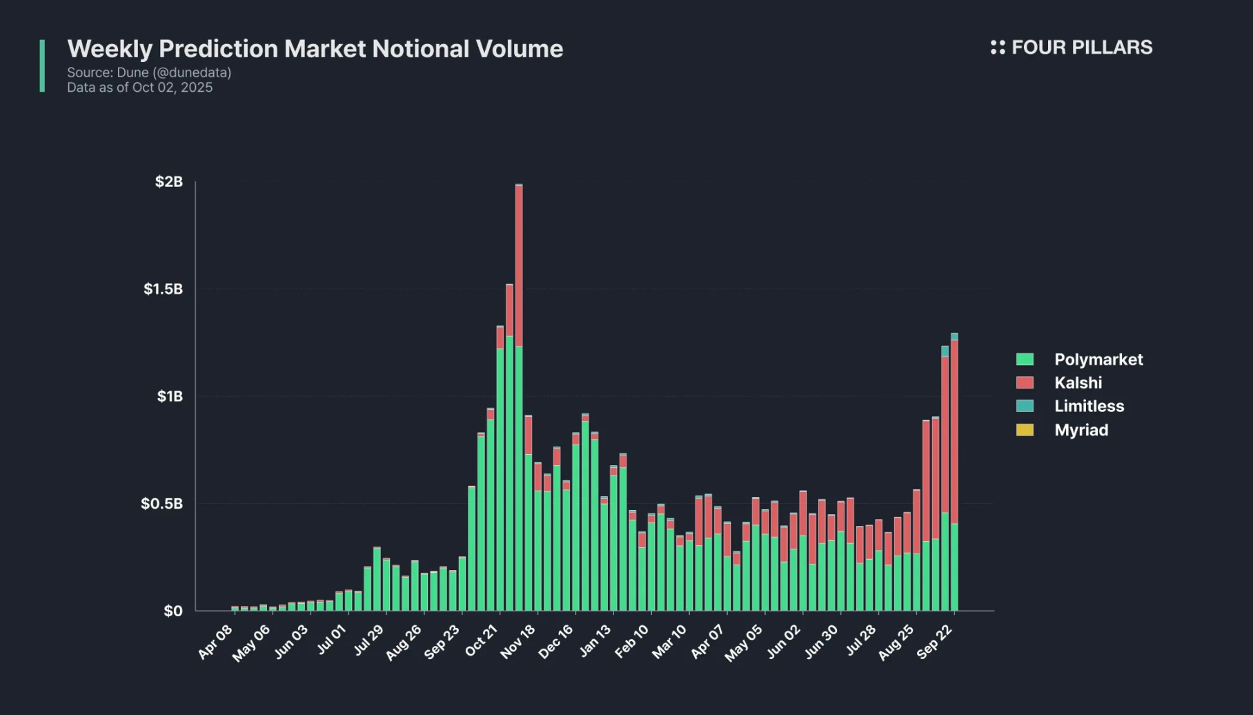 칼시의 융자 탄탄한 실적에 힘입은 것입니다. 칼시의 유동성 풀은 깊이가 풍부하고 평균 슬리피지(slippage)는 0.1% 미만으로 업계 평균보다 훨씬 낮습니다. 재정적으로는 수익성이 높으며, 2025년 상반기 매출은 2억 달러를 돌파했는데, 이는 주로 0.5~1%의 거래 수수료 덕분입니다. 듄 데이터에 따르면, 칼시의 주간 예상 시장 거래량은 추종자 수준에서 빠르게 상승하여 폴리마켓(Polymarket)을 넘어섰습니다.