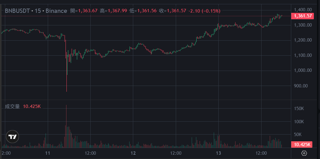 1011 암호화폐 시장 폭락 이후 비트코인과 이더 제외하고 가장 최근 반등한 주류 암호화폐는 단연 바이낸스의 플랫폼 코인인 BNB입니다. 바이낸스의 현물 시장 데이터에 따르면, 어젯밤 암호화폐 시장이 반등한 이후(12), BNB는 오늘(13) 이전 손실을 빠르게 회복하며 단숨에 1,375달러까지 치솟으며 역대 신고점 기록했습니다.