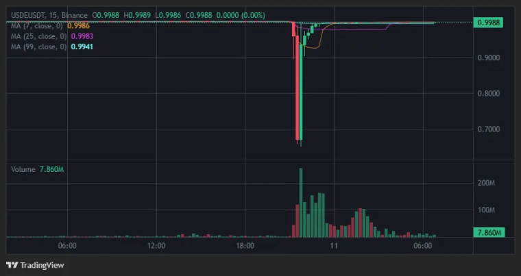 이번 주말 시장 혼란 속에서 이더리움(Ethena)의 가격 연동 해제에 대한 논의가 많이 있었습니다 . 이더리움의 스테이블코인인 USDe는 잠시 $0.68까지 연동 해제되었다가 회복되었습니다. 모두가 인용했던 바이낸스 차트는 다음과 같습니다.