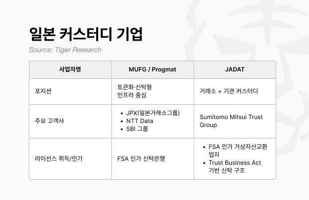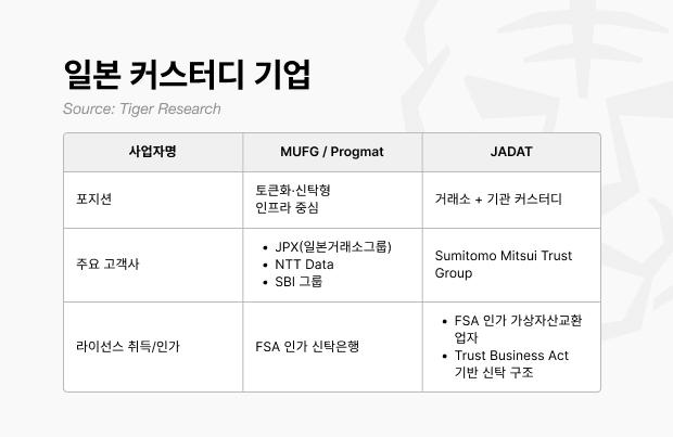 이처럼 높은 규제 장벽 때문에 일본 커스터디 시장은 웹3 네이티브 기업보다 전통 금융그룹이 주도하는 구조로 자리 잡았다. 자본력과 시스템 인프라를 갖춘 금융그룹만이 FSA의 까다로운 요구사항을 충족할 수 있기 때문이다.