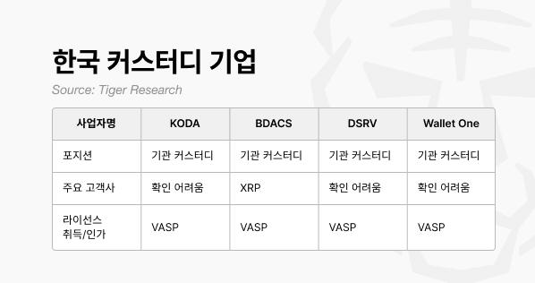 한국의 커스터디 산업은 특금법 체계 아래 관리되며, 가상자산사업자(VASP) 신고로 운영된다. 한국 시장의 특징은 금융기관 연계와 기술 기반 분화가 동시에 진행된다는 점이다. KODA처럼 전통 금융기관이 주축이 된 합작 모델부터, 스타트업이 보안 및 인프라 차별화로 승부하는 구조까지 다양한 유형이 공존한다.