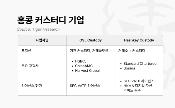 OSL은 거래소와 연계된 커스터디, OTC, 토큰화 서비스를 통합 제공하며, 특히 홍콩에서 승인된 현물 가상자산 ETF 4개 중 3개에 커스터디를 지원하고 있다. 해시키(HashKey)는 스탠다드 차타드(Standard Chartered)와의 협력을 통해 기관 투자자를 대상으로 법정화폐 온, 오프램프 서비스를 제공하며, 자사 인프라를 활용해 가상자산–법정화폐 정산 효율성을 강화하고 있다.