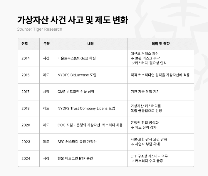 커스터디 산업은 ‘사고’에서 시작되었다. 2014년 일본 거래소인 마운트곡스 해킹 사건이 그 시작점이었다. 당시 약 85만 개의 비트코인이 유출되면서 고객들은 막대한 손실을 입었다. 이 사건은 “자산을 안전하게 보관할 제도적 장치가 없다면 시장에서 사업을 영위할 수 없다”는 인식을 업계 전반에 심어줬다.