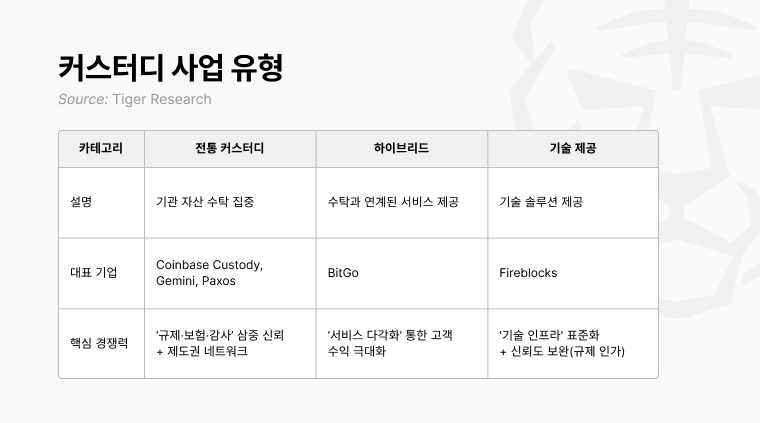 커스터디 사업자는 대체로 수탁 서비스를 기반으로 하되, 다양한 부가 서비스를 제공한다. 즉, 사업의 주요 방향성이 어디에 무게를 두느냐에 따라 시장 내 포지셔닝과 경쟁력이 완전히 달라진다.