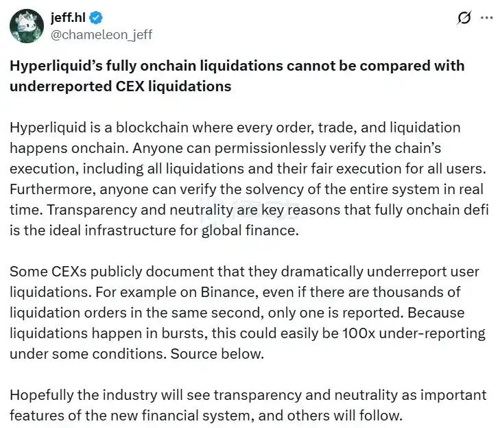 하이퍼리퀴드(Hyperliquid)의 창립자 제프 얀(Jeff Yan)은 소셜 미디어를 통해 직접 반박했습니다. "일부 중앙화 거래소는 사용자 청산 건수를 심각하게 축소 보고한다고 공개적으로 밝혔습니다. 예를 들어 바이낸스에서는 같은 시간에 수천 건의 청산 주문이 접수되더라도 단 하나만 보고됩니다. 청산은 갑작스러운 일이기 때문에 축소 보고 건수가 100배에 달하는 경우도 있습니다."