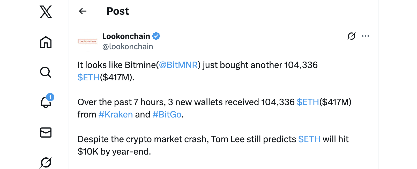 비트마인 회장 톰 리는 이더리움이 연말까지 1만 달러를 돌파할 것으로 예상하고 있습니다. 블록체인 추적 업체들은 세 개의 지갑에 각각 약 7,500만 달러가 입금되었다고 확인하며, 이는 새로운 자금 유입을 시사합니다.