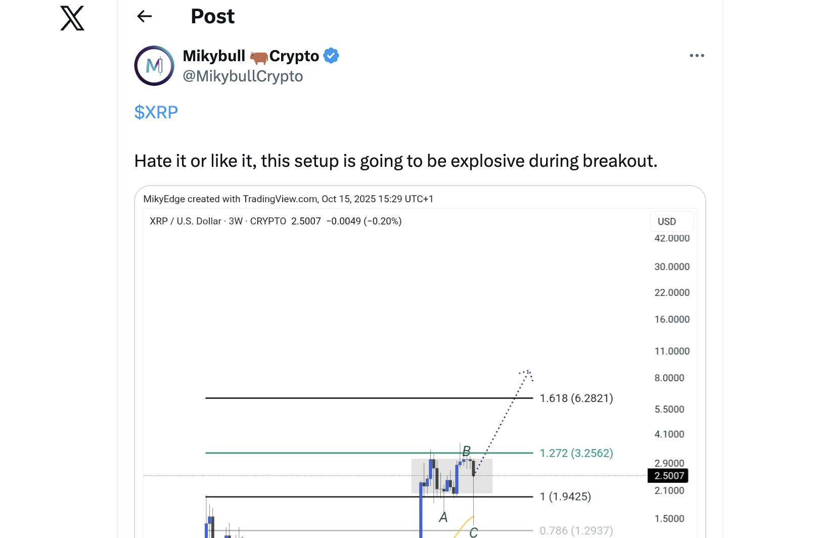 애널리스트 미키불은 XRP 차트 구성이 "폭발적"이라고 분석했습니다. XRP는 몇 주 동안 2.50달러 근처에서 횡보세를 보이며 잠재적 돌파를 위한 에너지를 축적해 왔습니다. 이번 주 14% 하락 했음에도 불구하고, 많은 애널리스트들은 조정 국면이 마무리됨에 따라 향후 긍정적인 흐름이 이어질 것으로 예상합니다.