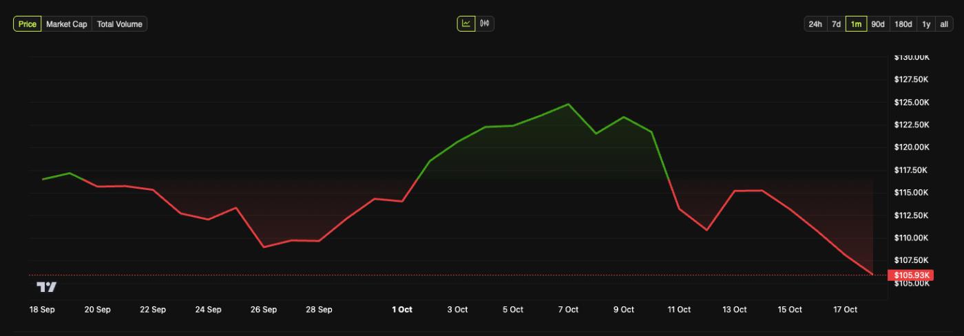 두 인물의 극명하게 대조되는 전망은 디지털 자산 부문을 휩쓸고 있는 불확실성을 여실히 드러냅니다. 10월 7일 126,198달러라는 사상 최고치를 기록했던 비트코인은 미중 무역 갈등 재개와 은행권의 스트레스 심화로 10일 만에 17% 이상 하락했습니다.