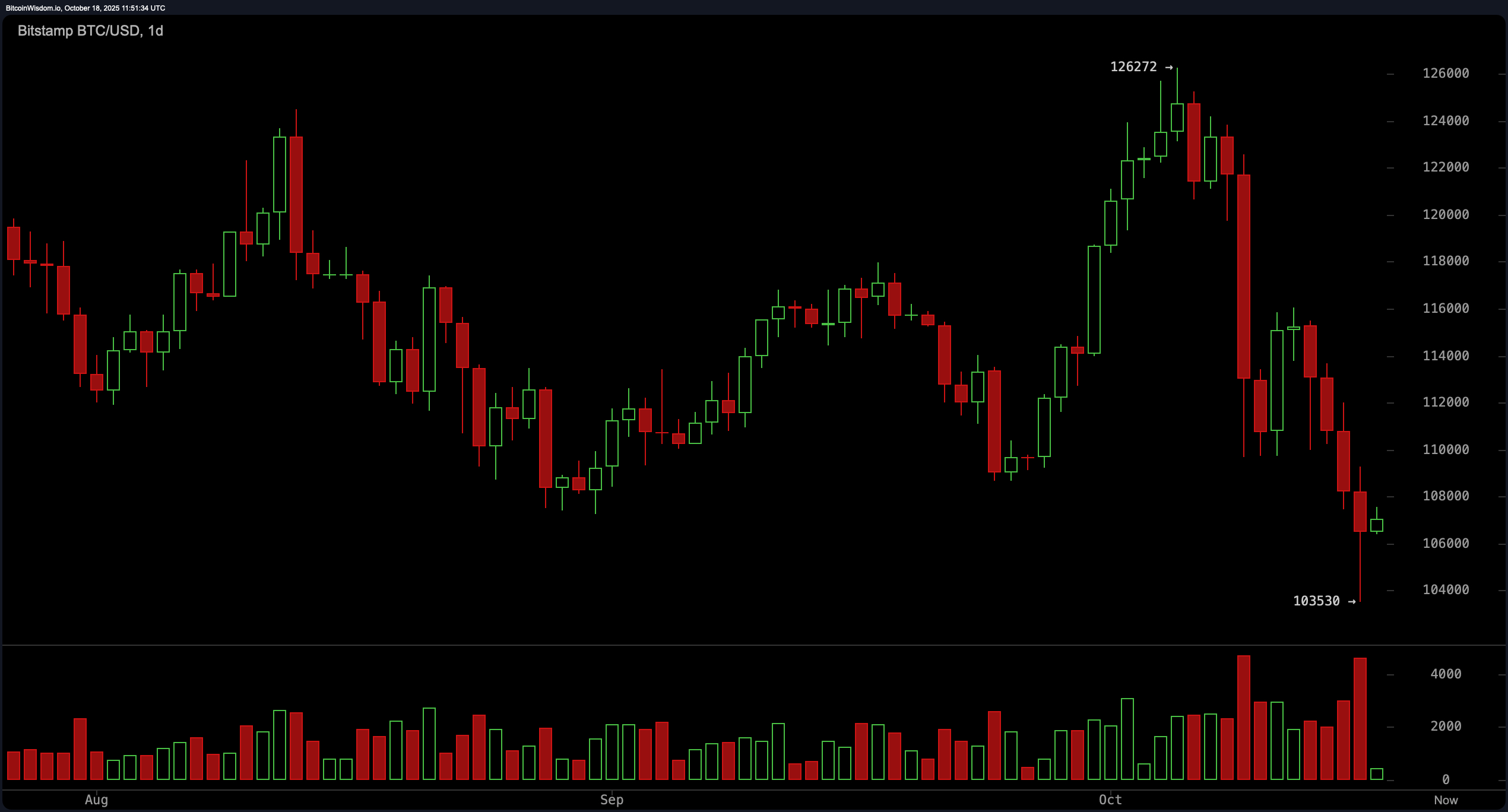일간 차트는 126,272달러의 고점 이후 시작된 거시적 약세 추세를 반영하고 있습니다. 비트코인은 이후 상당한 하락 압력을 받아 여러 개의 연속적인 빨간색 캔들과 거래량 증가를 동반하며 시장 전반의 하락세를 보였습니다. 가격은 103,500달러~106,000달러의 지지선 위에서 안정세를 보인 것으로 보이며, 최근 장중에서는 소폭의 강세 캔들이 나타났습니다.