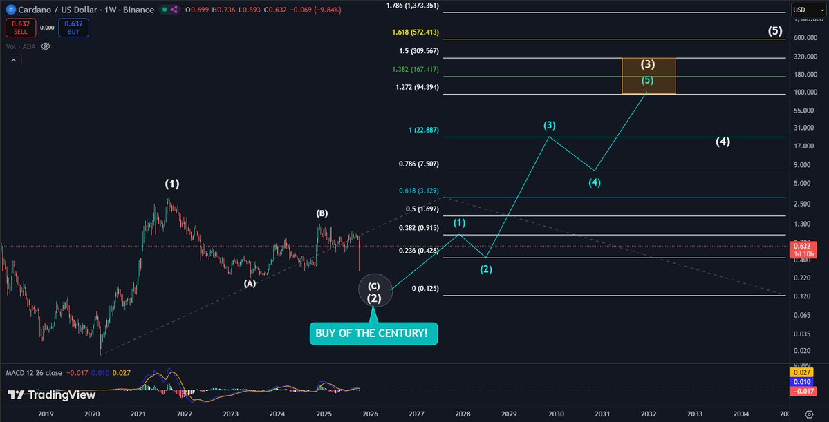 - 브라운스톤 씨가 게시한 X 게시물 : 에이다(ADA) "세기의 매수"라고 부르며, 축적이 늘어나면 극단적인 장기 목표가 예상되며, 피보나치 파동 예측은 향후 사이클에서 최대 572달러까지 올라갈 수 있다고 합니다.