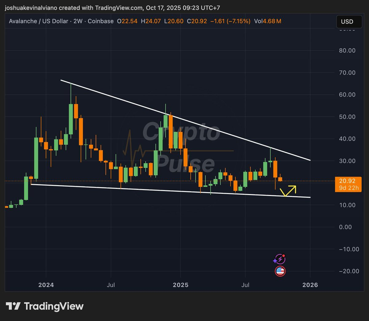 투자자들이 강세 차트 구성을 주목하면서 애벌랜치(Avalanche)도 주목을 받고 있습니다. CryptoPulse의 X 게시물은 아발란체(AVAX) 2W 차트에서 하락 쐐기 강조하며, 모멘텀이 형성될 경우 $14 지지선에서 $30~$50까지 반등할 가능성을 시사했습니다.