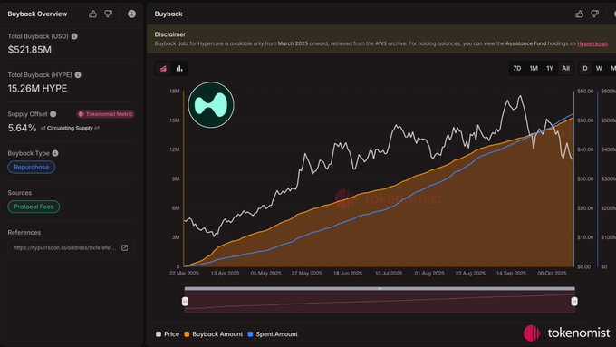 하이퍼리퀴드는 5억 2,100만 달러 이상의 토큰을 지속적으로 환매해 왔습니다. 이러한 환매는 유통 공급량의 5.6% 이상을 대체했으며, 이는 꾸준한 프로토콜 수익을 보여줍니다. 유동성 공급의 점진적인 감소는 최근 가격 조정 시 완충 역할을 했으며, 이를 통해 회복의 좋은 토대를 마련했습니다.