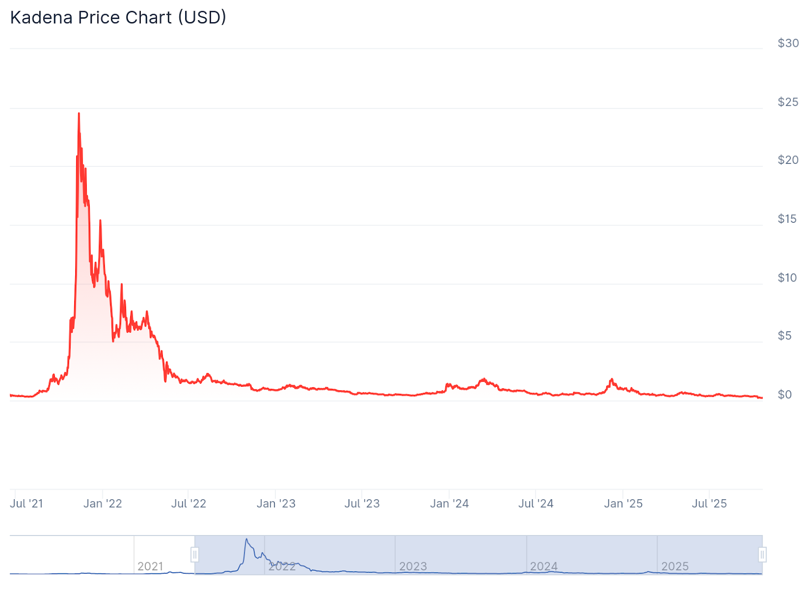 카데나(KDA) 해당 소식 이후 오늘 60% 하락했고, 지난 1년 동안 85% 하락하여 3천만 달러의 가치를 기록했습니다. 현재 KDA 토큰은 2021년 사상 최고가인 270억 달러보다 99.7% 낮은 가격에 거래되고 있으며, 만약 그렇다면 2025년 완전 희석 가치(FDV) 기준 상위 15위 암호화폐가 되었을 것입니다.