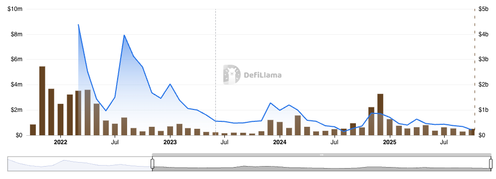 Total Value Locked(TVL) ( TVL(Total Value Locked) ) 및 카데나(KDA) 거래량 같은 체인 지표는 2021년과 2022년에 정점을 찍었으며, 2022년 3월에는 역대 최고 Total Value Locked(TVL) 900만 달러에 달 했습니다. 당시 카데나(KDA) 토큰은 65억 달러의 FDV를 선전했습니다.