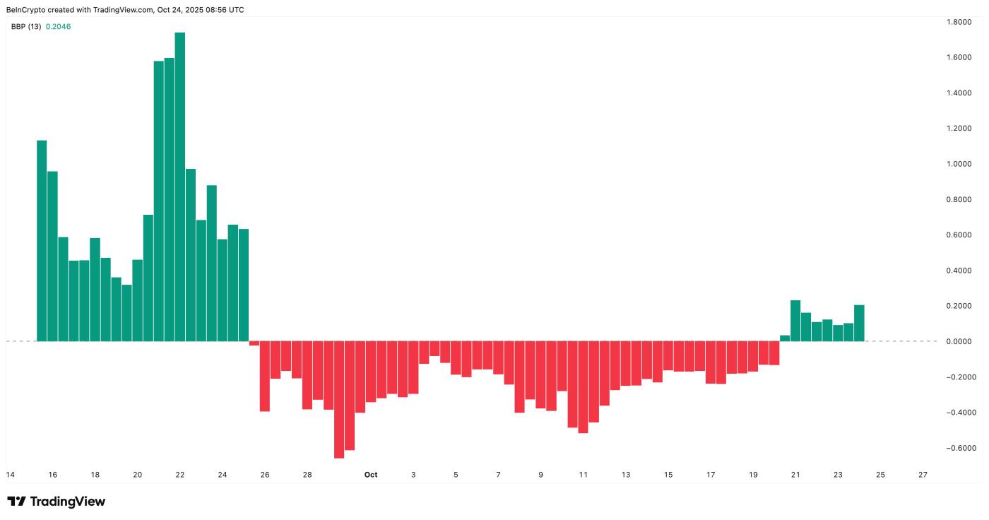 매수 및 매도 압력을 비교하는 지표인 불 Bear Power(BBP)는 가격이 평균에서 얼마나 움직이는지 추적하는데, 이 지표는 10월 20일부터 녹색으로 바뀌었습니다.