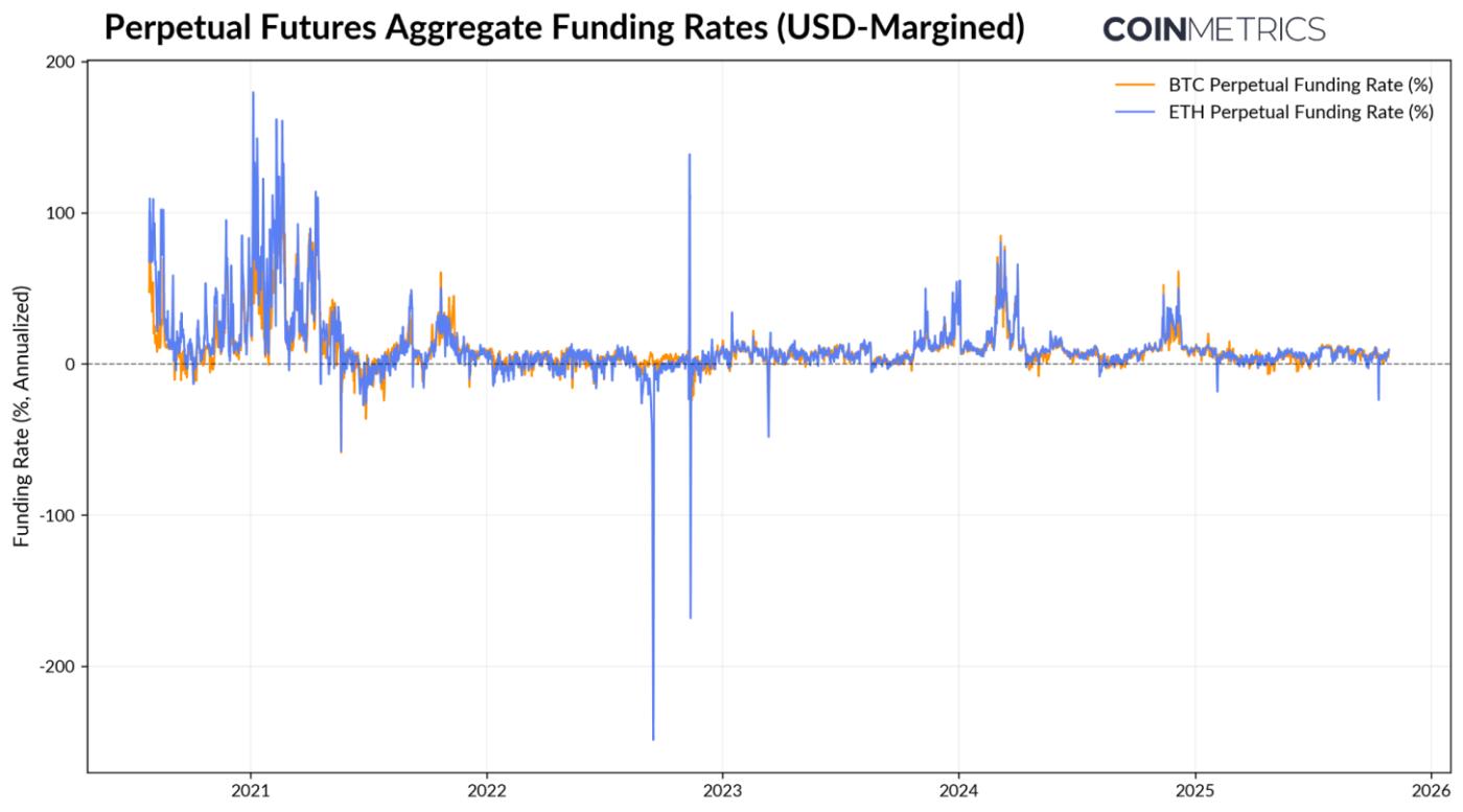 위 차트에서 볼 수 있듯이, 비트코인(BTC) 와 이더리움(ETH) 의 총 선물 자금 조달 금리는 불 기간 동안 플러스(+)를 기록했으며, 2024년에는 연평균 약 11%, 2025년에는 약 5%를 기록했습니다. 지속적으로 높은 금리가 유지된다는 것은 시장이 롱 포지션을 취하는 데 비용을 지불하는 환경을 시사하며, 이테나는 델타 중립 전략을 통해 이러한 스프레드를 확보할 수 있습니다. 그러나 루나(Luna)와 3AC, 2022년 11월 FTX 폭락, 그리고 2025년 10월 플래시 크래시와 같은 시장 스트레스 상황에서는 자금 조달이 마이너스로 전환되어 프로토콜의 안정성과 수익 창출에 시험대를 마련했습니다.