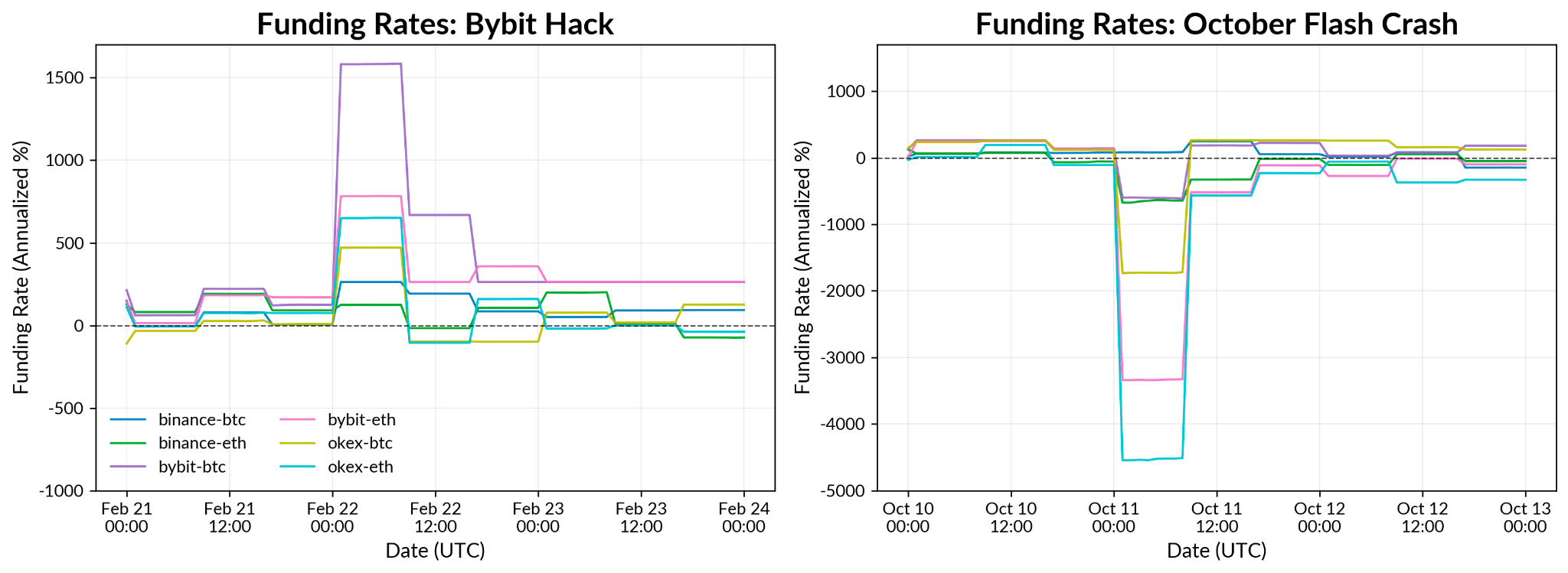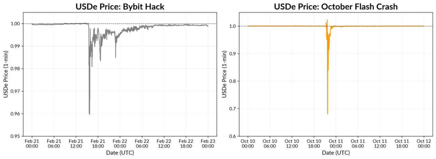 2025년 시장 스트레스 사건들은 Ethena의 합성 달러 시스템이 변동성 하에서 어떻게 작동하는지에 대한 현실적인 시각을 제공합니다. 2월 바이비트(Bybit) 해킹 사건과 10월 10일 플래시 크래시를 통해 이를 확인할 수 있는데, 두 사건 모두 주말까지 전통 시장이 멈춘 가운데 발생했습니다.