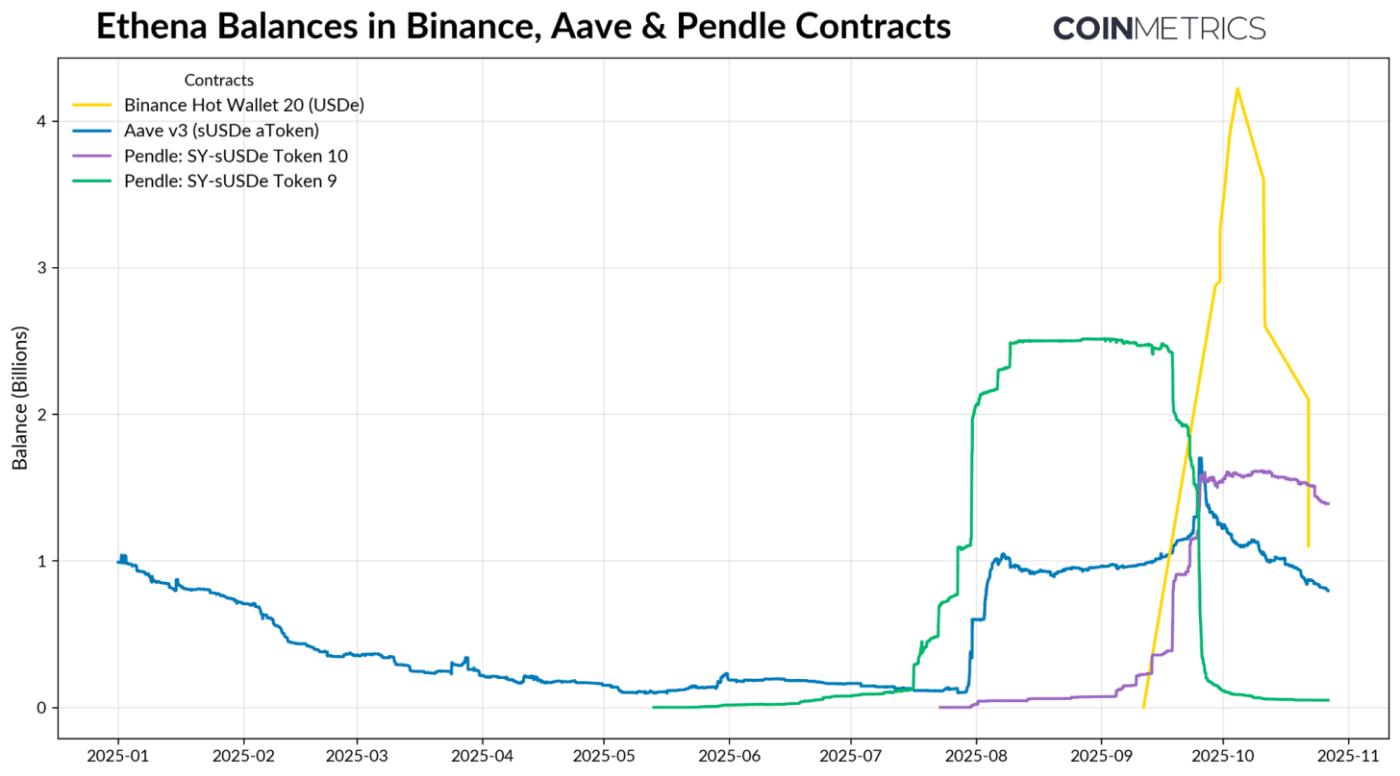 위 상위 홀더 계좌의 잔액 스냅샷(2025년 10월 기준)을 보면, USDe 공급량의 약 절반이 수익 기반 sUSDe를 받기 위해 스테이킹되어 있는 것을 확인할 수 있습니다. 약 13%는 LayerZero의 OFT 브릿지에 예치되어 크로스체인 유동성을 촉진하고 있으며, 두 개의 바이낸스 지갑이 공급량의 약 14%를 보유하고 있습니다. 바이낸스가 9월 선물 거래 및 바이낸스 언(Binance Earn)을 위한 증거금 자산으로 USDe를 통합한 이후, 40억 달러 이상의 USDe가 바이낸스로 빠르게 유입되었습니다. 그러나 바이낸스에서 USDe의 가격 변동 으로 인해 29억 달러의 자금 유출이 발생하여 잠시 $0.67까지 하락했습니다.