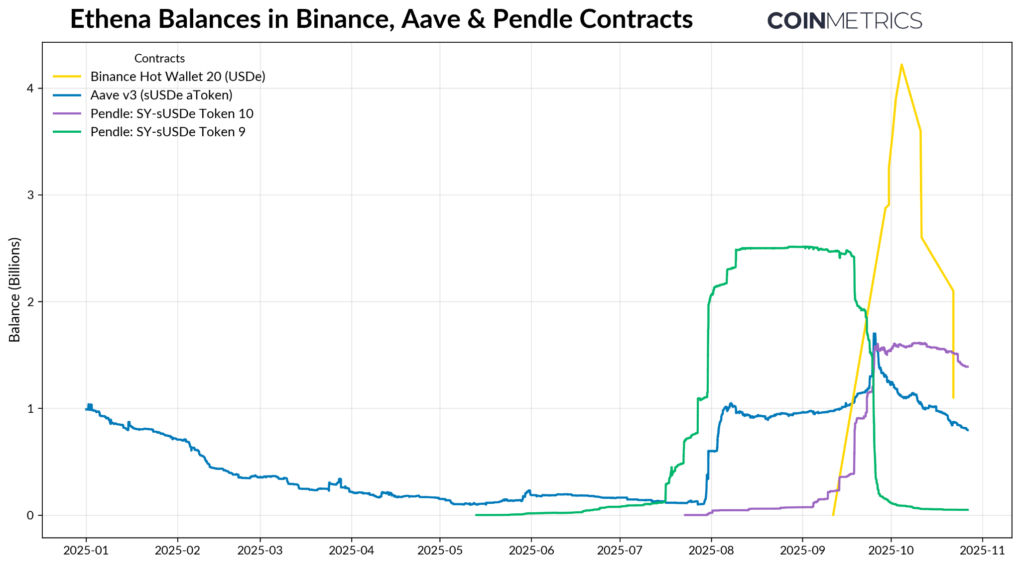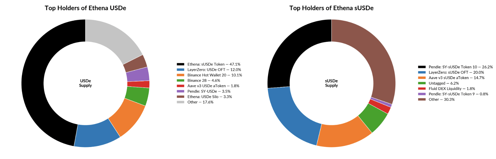 반면, sUSDe 공급의 대부분은 DeFi 프로토콜에 존재합니다. 아베(AAVE) (대출)와 펜들(Pendle) (수익 토큰화)은 사용자들이 담보 대출 및 온체인 수익 전략에 토큰을 활용함에 따라 전체 sUSDe 유통량의 3분의 1 이상을 차지합니다. 이는 USDe를 민트(Mint) 하여 sUSDe를 발행하고, 이 sUSDe는 토큰화된 펜들(Pendle) 에 예치되어 아베(AAVE) 의 담보로 재사용되는 "수익률 증폭" 루프를 생성합니다. 이를 통해 자본 효율성과 자산화 가능성이 향상되는 동시에 온체인 레버리지 및 유동성 역학과의 더욱 긴밀한 연계가 이루어집니다.