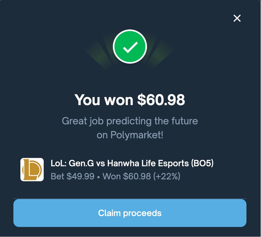 - 최근 Polymarket의 토큰 출시 및 미국 재진입 소식에 소액 베팅을 하고 있습니다. 이전에는 회사 내부에서 진행한 200 USDT 거래 대회에서 시장 예측을 통해 간신히 투자금을 두 배로 늘렸습니다. 최근에는 리그 오브 레전드 월드 챔피언십 경기를 시청하며 10 USDT "God of War"처럼 승패가 더 많은 흥미로운 팀에 베팅하고 있습니다. 제 일반적인 전략은 LCK(한국) 팀이 상장되면 베팅하고, 상장되지 않으면 중국 팀에 베팅하는 것입니다. 특히 Gen.G가 상장되면 베팅하는 것입니다. 이는 제 개인적인 의견일 뿐이며 신뢰할 수 없습니다. 또 다른 적절한 베팅은 Polymarket이 연말까지 미국에 복귀할지 여부입니다. 현재 80%의 사람들이 Polymarket이 미국에 복귀할 것이라고 생각하고 있으며, 11월 말 이전에 오픈할 것이라는 소문도 있었습니다. Polymarket을 구매할지 여부는 직접 판단해 보세요.