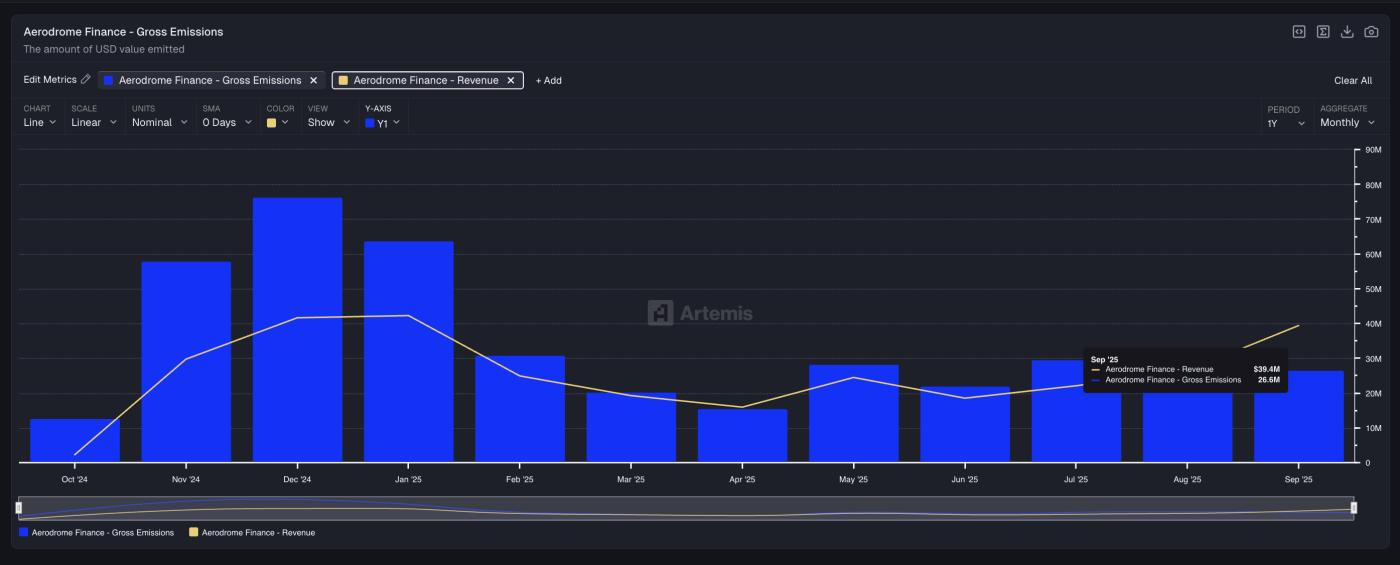 마지막으로, AERO의 상승세는 개선된 프로토콜 기반 덕분이기도 했습니다. 2025년 9월, Aerodrome Finance는 매출이 배출량을 초과하며 이정표를 달성했습니다.