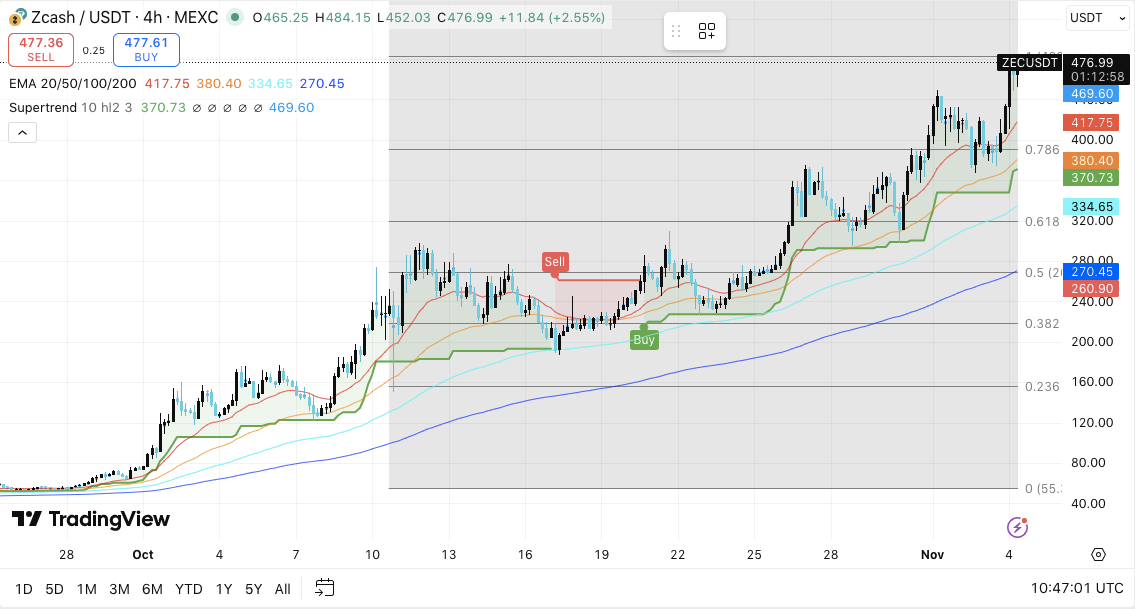4시간 차트는 연속적인 고점과 저점 상승으로 정의되는 명확한 상승 구조를 보여줍니다. 지캐시(ZEC) 최근 $452 근처에서 지지선을 테스트한 후 반등하여 마지막 거래일에서 2% 이상 상승했습니다.